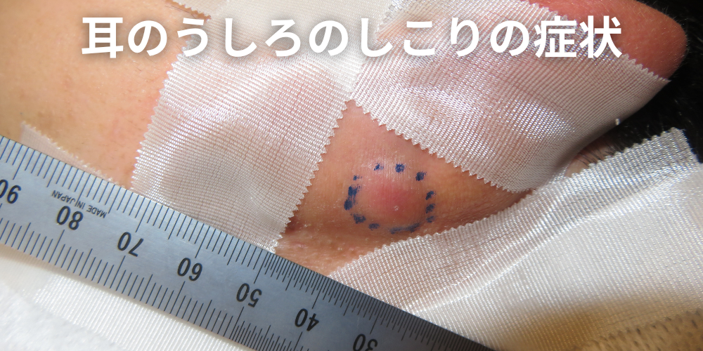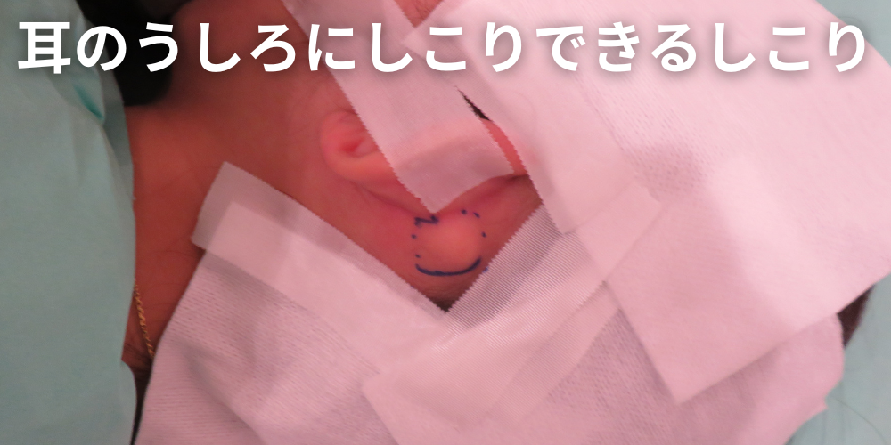 粉瘤は、皮膚の下に袋状の構造(嚢胞)ができ、角質や皮脂がたまることで生じる良性腫瘍です。耳の後ろは皮脂腺が多く、髪やマスクの刺激が加わりやすいため、粉瘤ができやすい部位のひとつです。