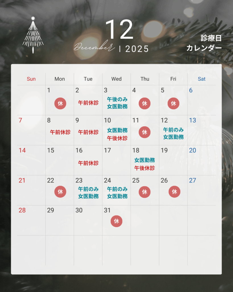 北海道皮膚のできものと粉瘤クリニック 古林形成外科札幌院より、2025年12月の休診日についてお知らせいたします。